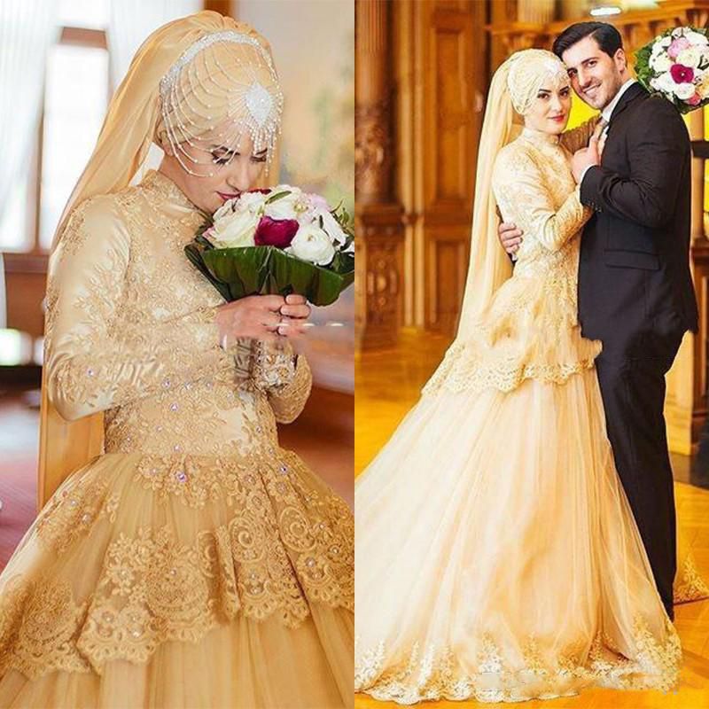 Luxury Gold Long Sleeve Muslim Wedding Dresses 2017 Turkish Traditional Gelinlik With Hijab Lace Beads Mideast Bridal Ball Gowns Cheap Ball Gowns Chiffon Wedding Dress From Bridallee 143 01 Dhgate Com